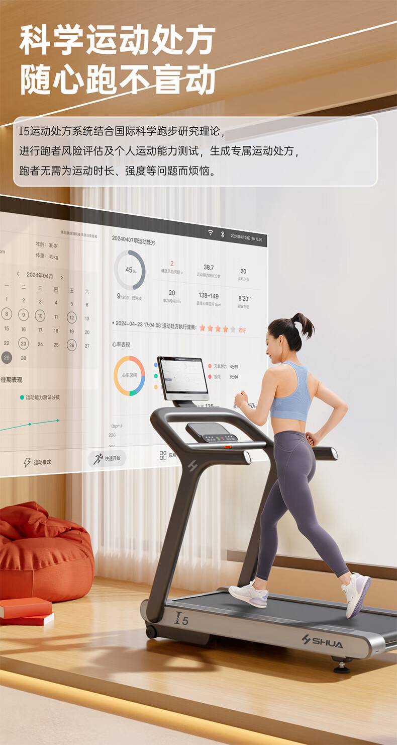 leyu.乐鱼SH-T580T I5跑步机,科学运动处方,随心跑不盲动,可根据个人运动处方心率区间及跑者的实时心率情况,自动调节速度或坡度,犹如你的专属“配速员”让你随“心”而跑无负担。