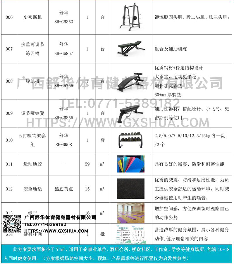 此方案要求面积小于74m²,适用于企事业单位、酒店会所、楼盘社区、工作室、学校等健身场所,能满10-18人同时健身使用。(方案根据场地空间大小、预算、产品需求等进行配置仅为启发性参考)