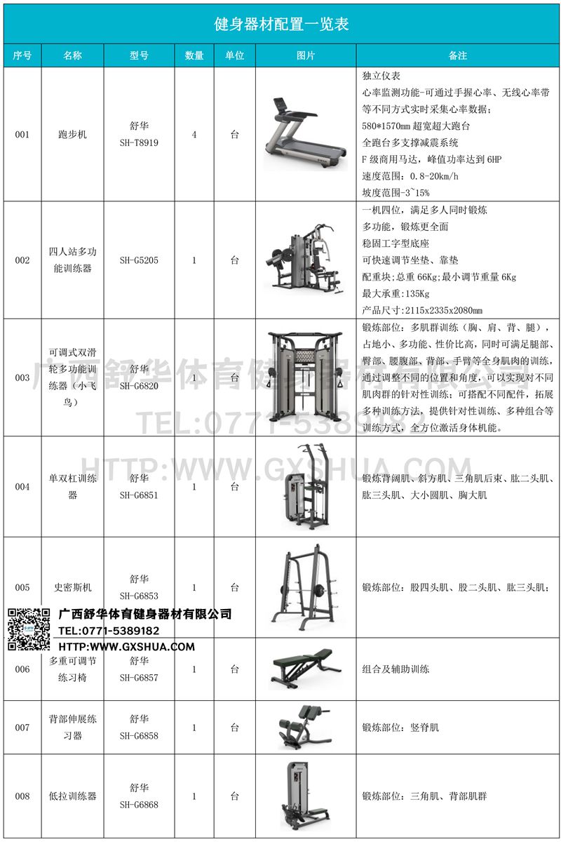 史密斯机(1台)、深蹲架(1台)、水平推举椅(1台)、多重可调节练习椅(1台)、腹肌训练器(1台)、罗马椅(1台)、上斜练习椅(1台)、10付哑铃套组(1套)、可调哑铃凳(1张)-可以实现对不同肌肉群的针对性训练,满足肌肉训练需求,全方位激活身体机能。